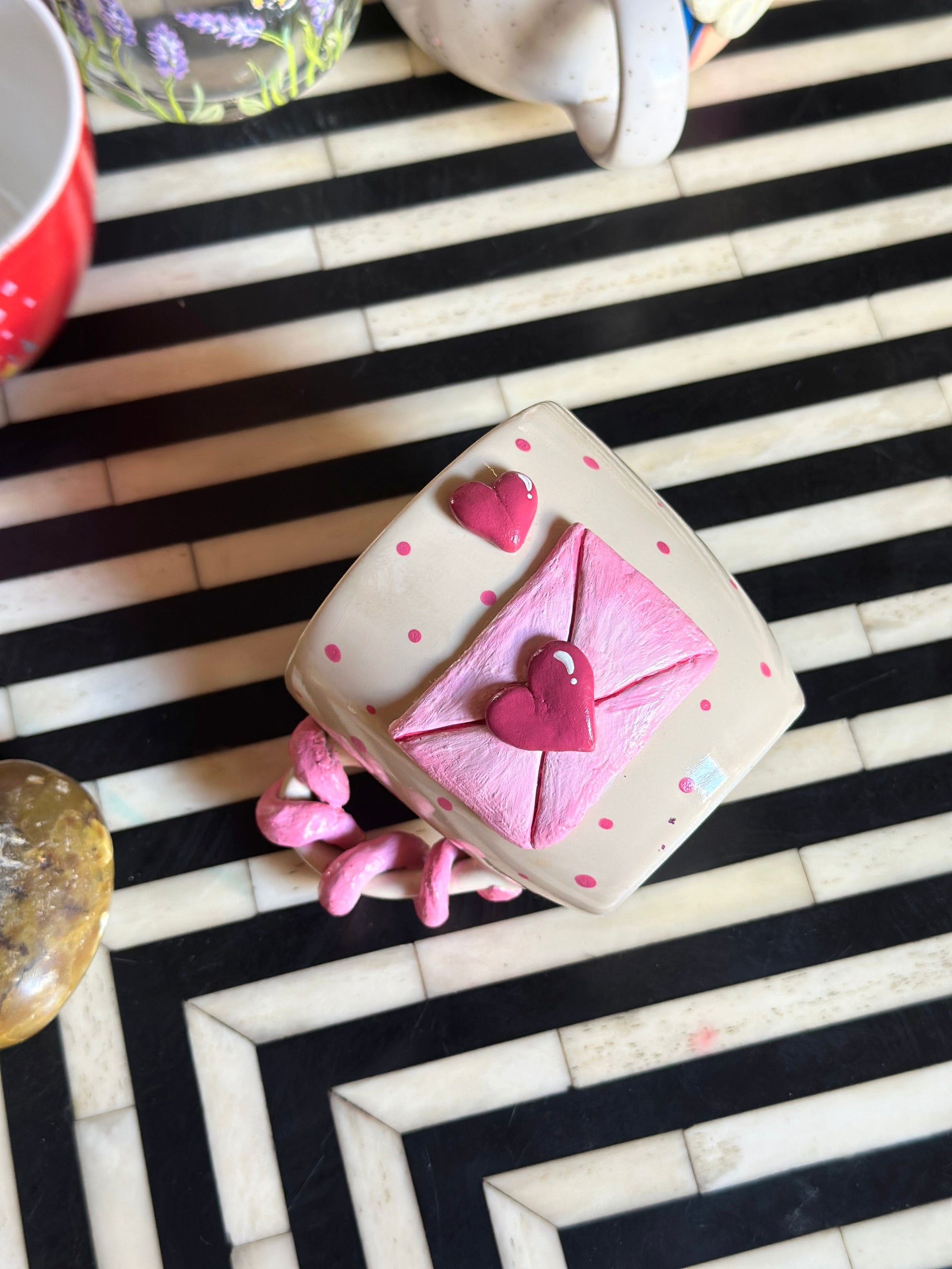 This hand-painted ceramic mug features a delicate envelope motif sealed with a raised heart, inspired by handwritten letters and old-school romance.