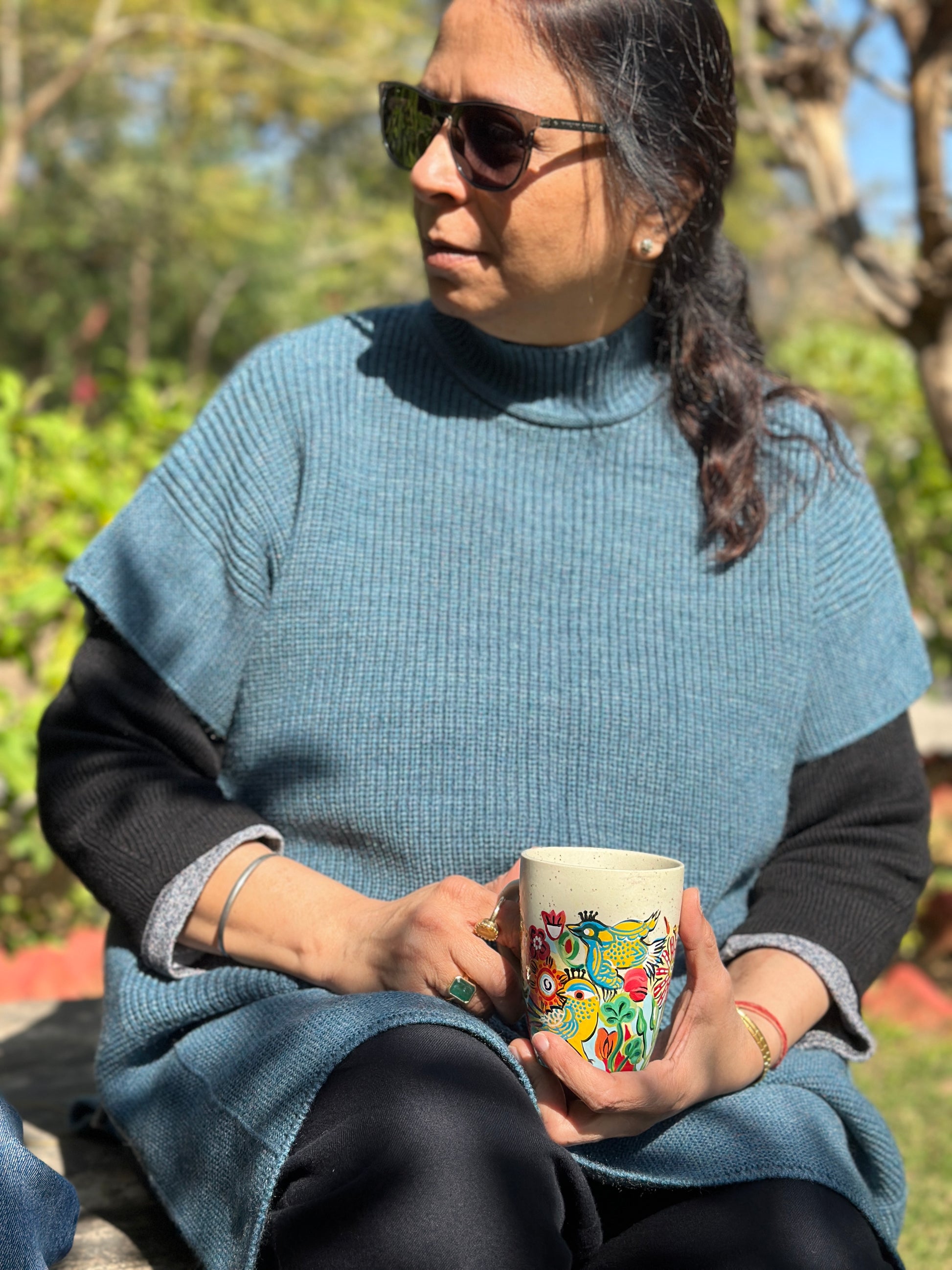Inspired by traditional folk motifs, the design celebrates nature, joy, and simple moments. The speckled ceramic base adds an earthy, handmade feel, while the comfortable shape makes it perfect for daily coffee, tea, or quiet breaks in between.