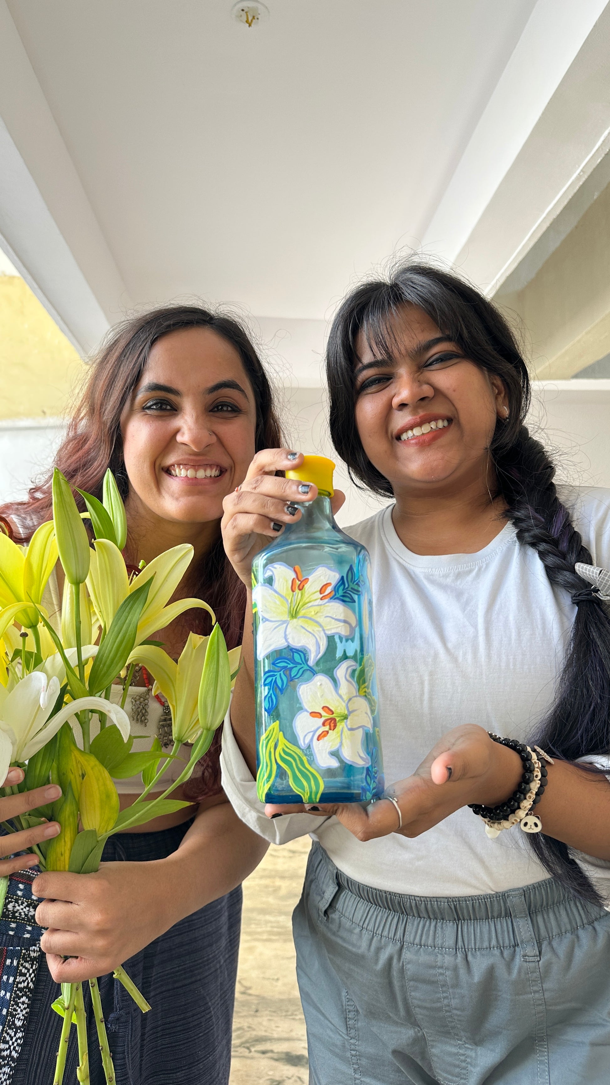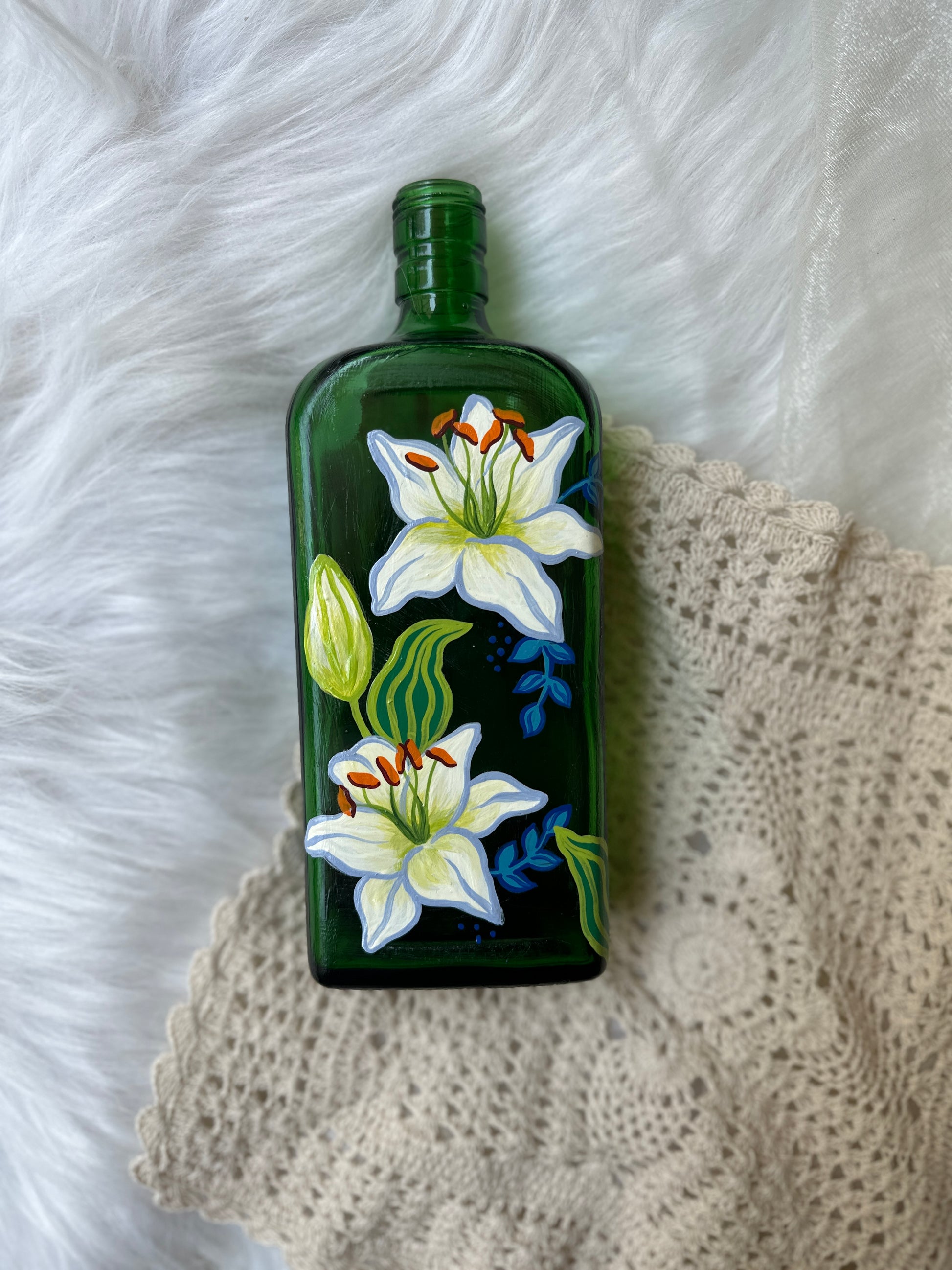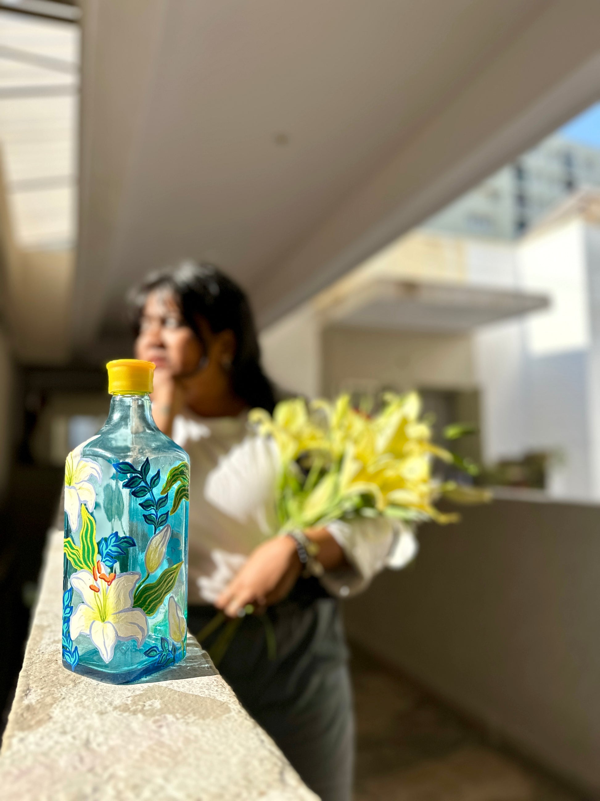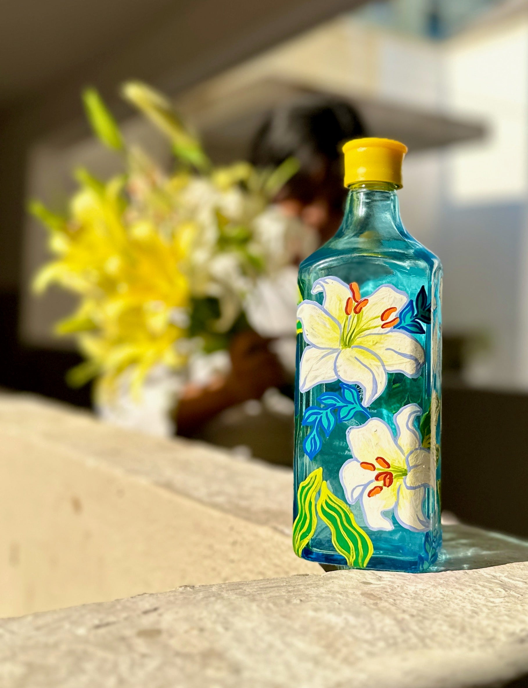 Explore the theme of flowers on glass bottles. Things that would be covered -