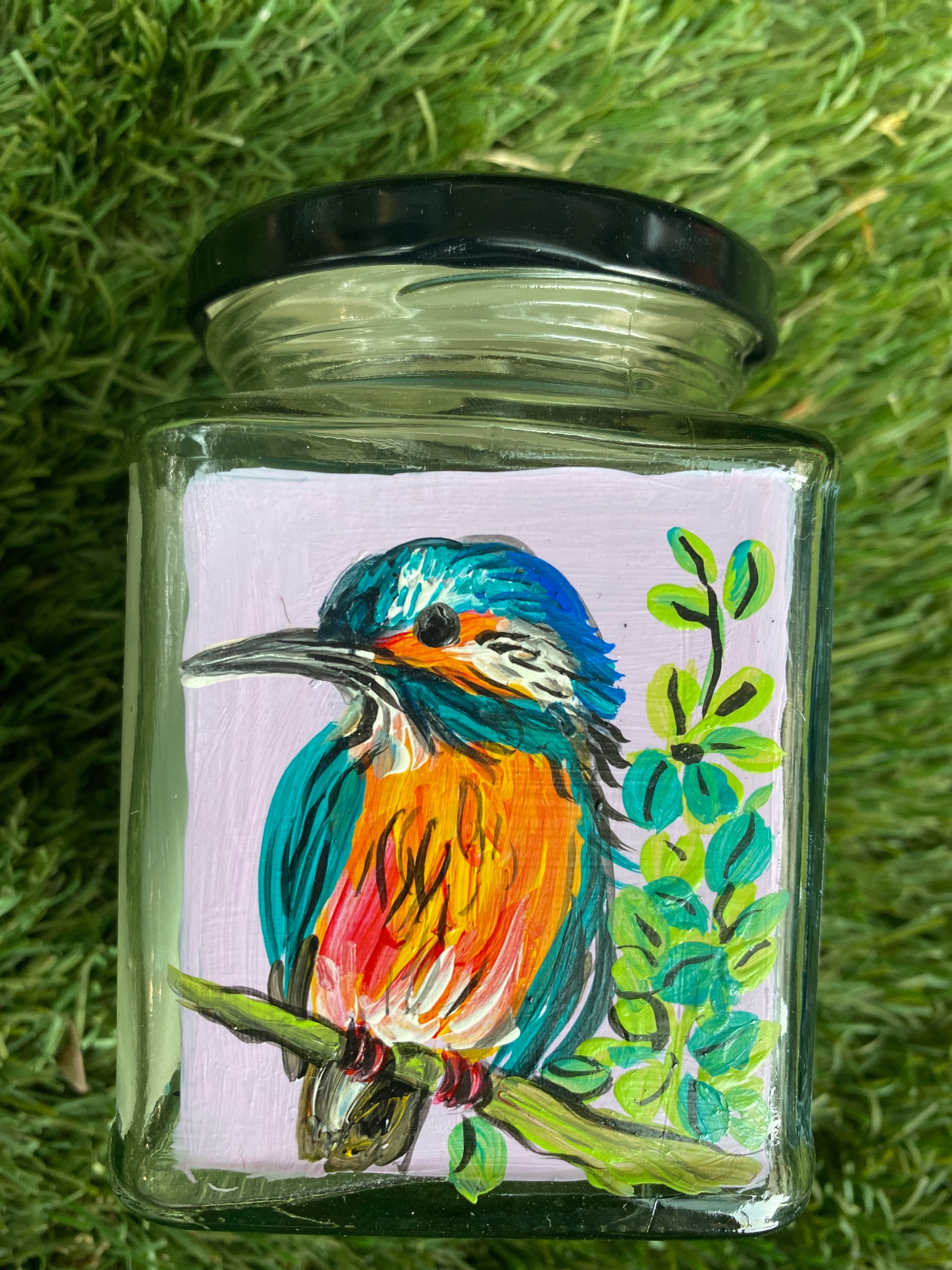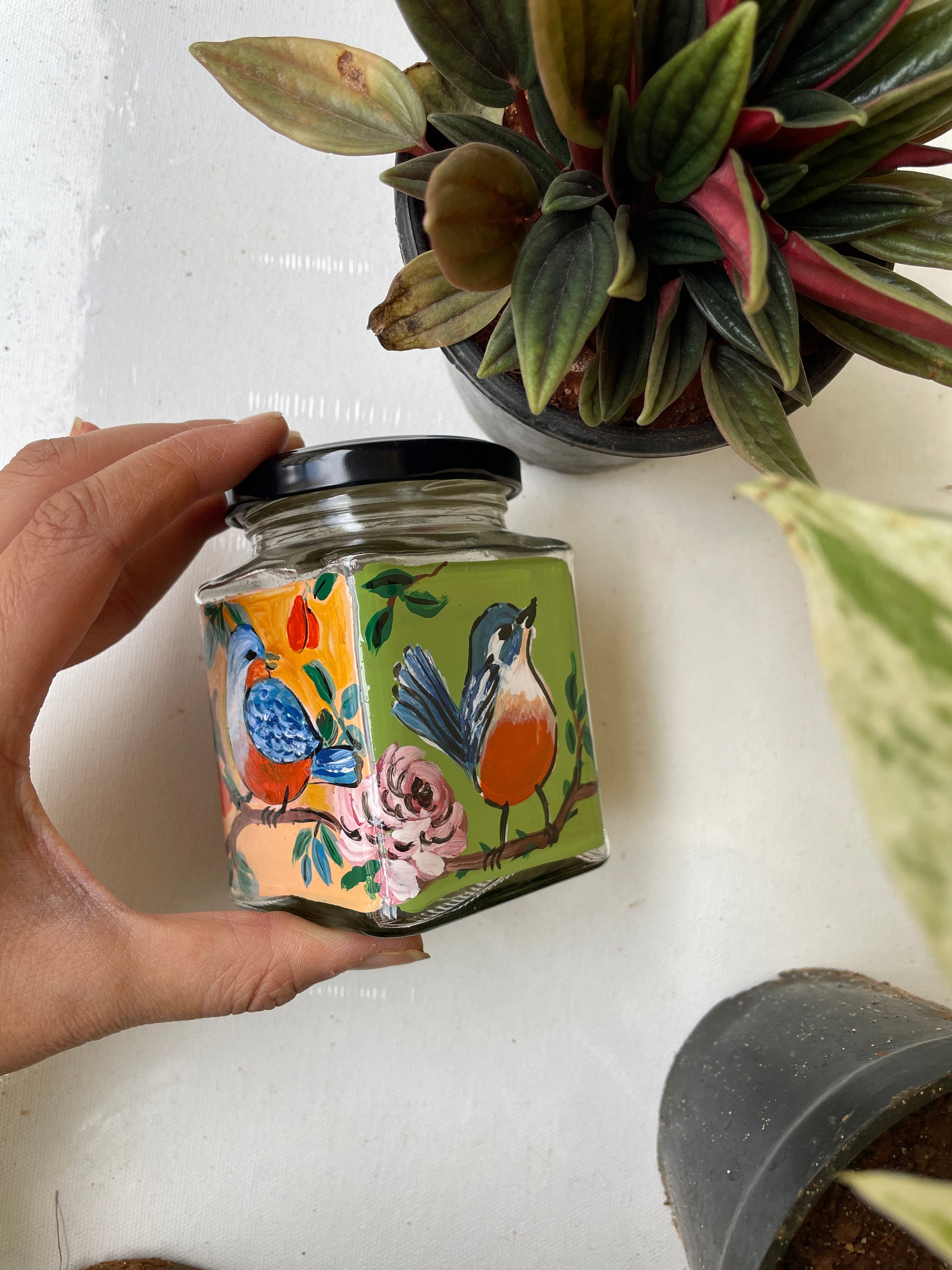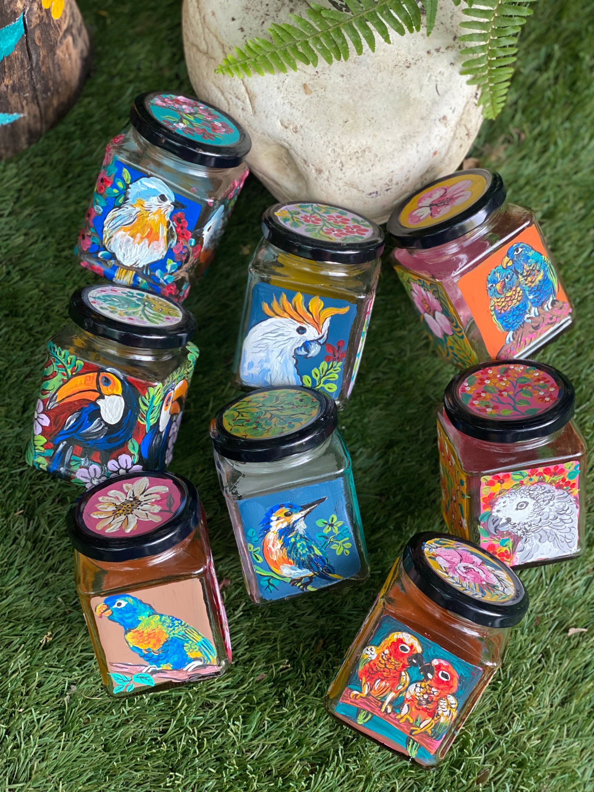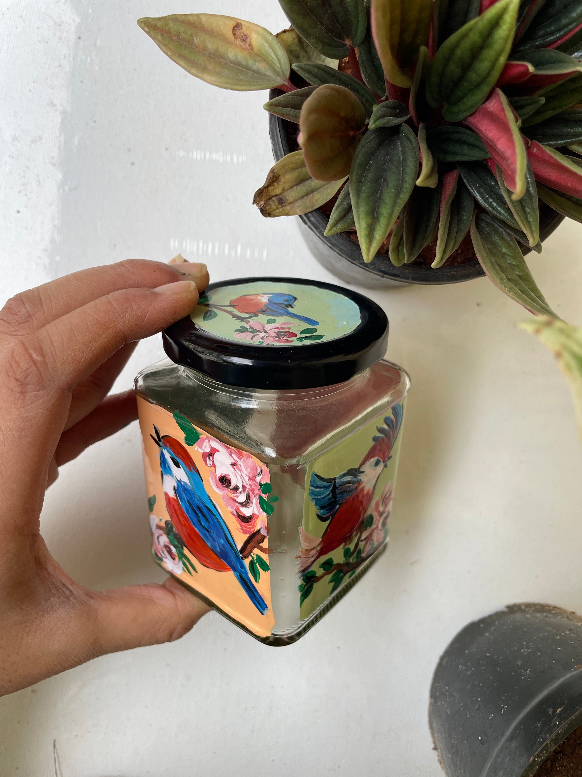 All 4 sides of the square jars are painted with different poses of the bird in different colours - so that if you get bored of one side, you can just switch to the other!