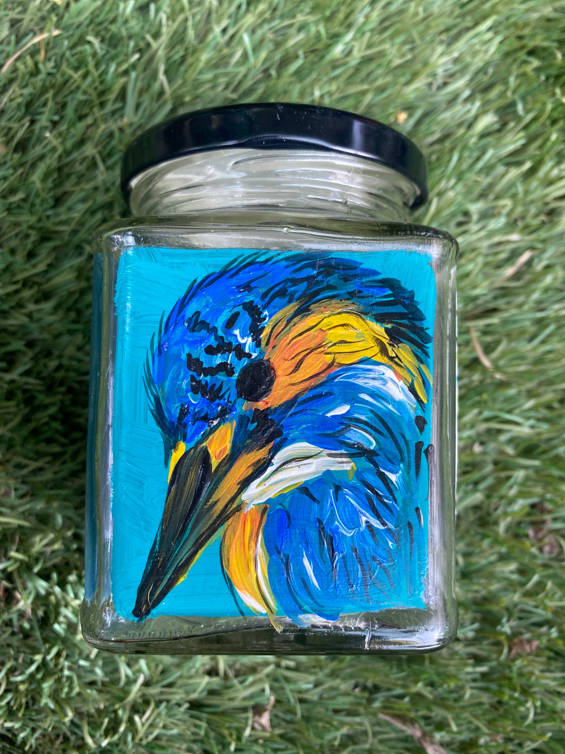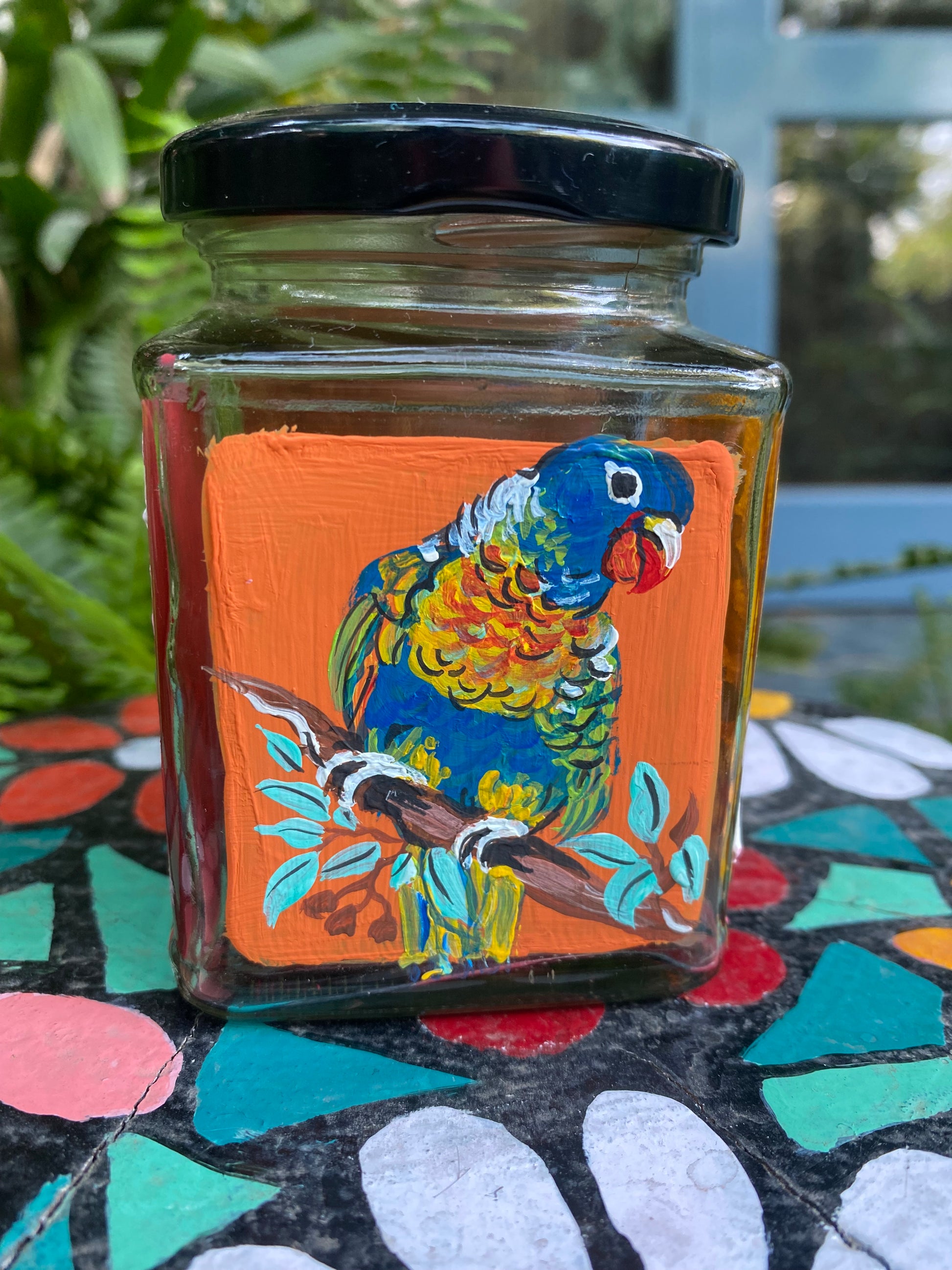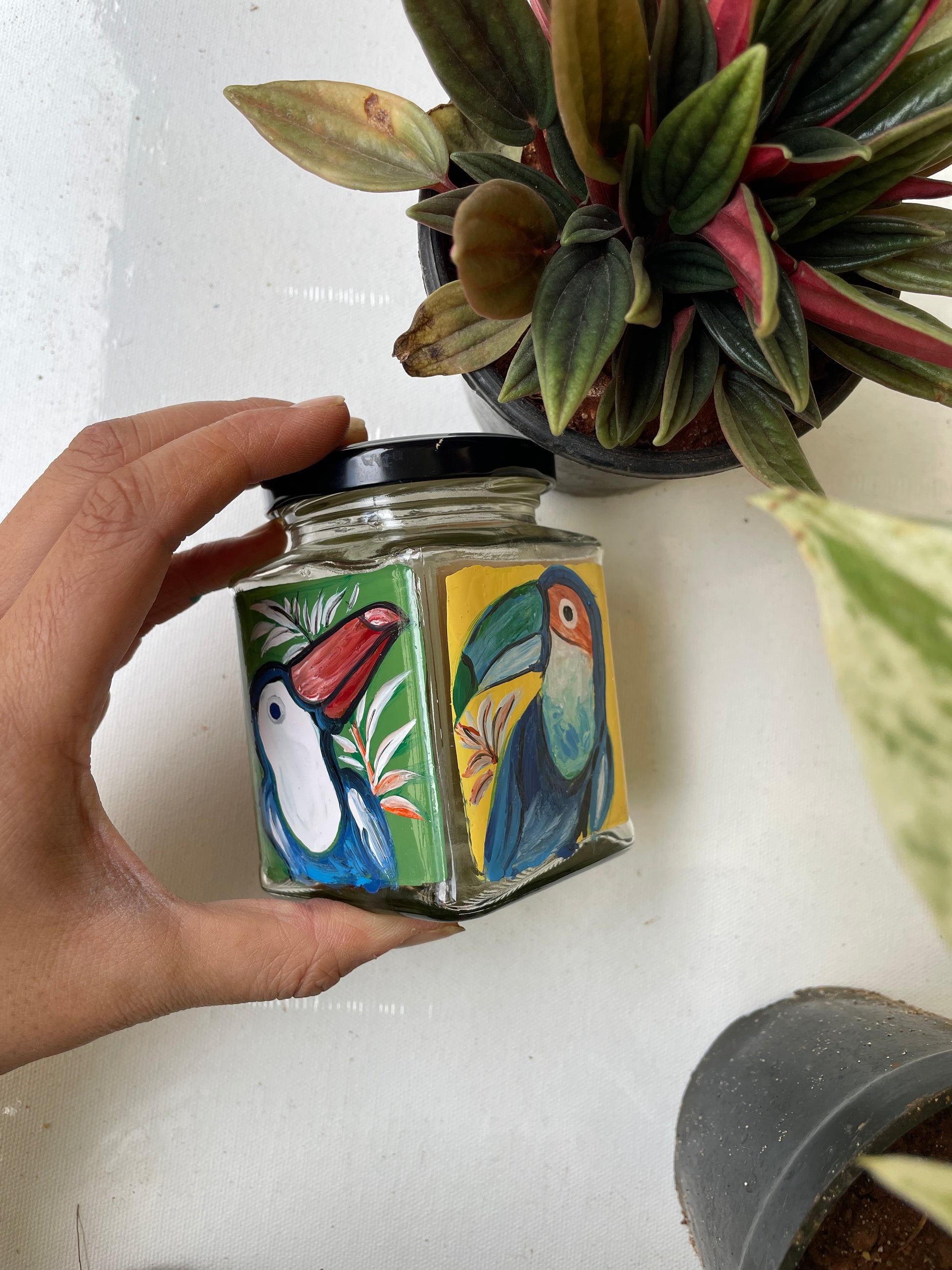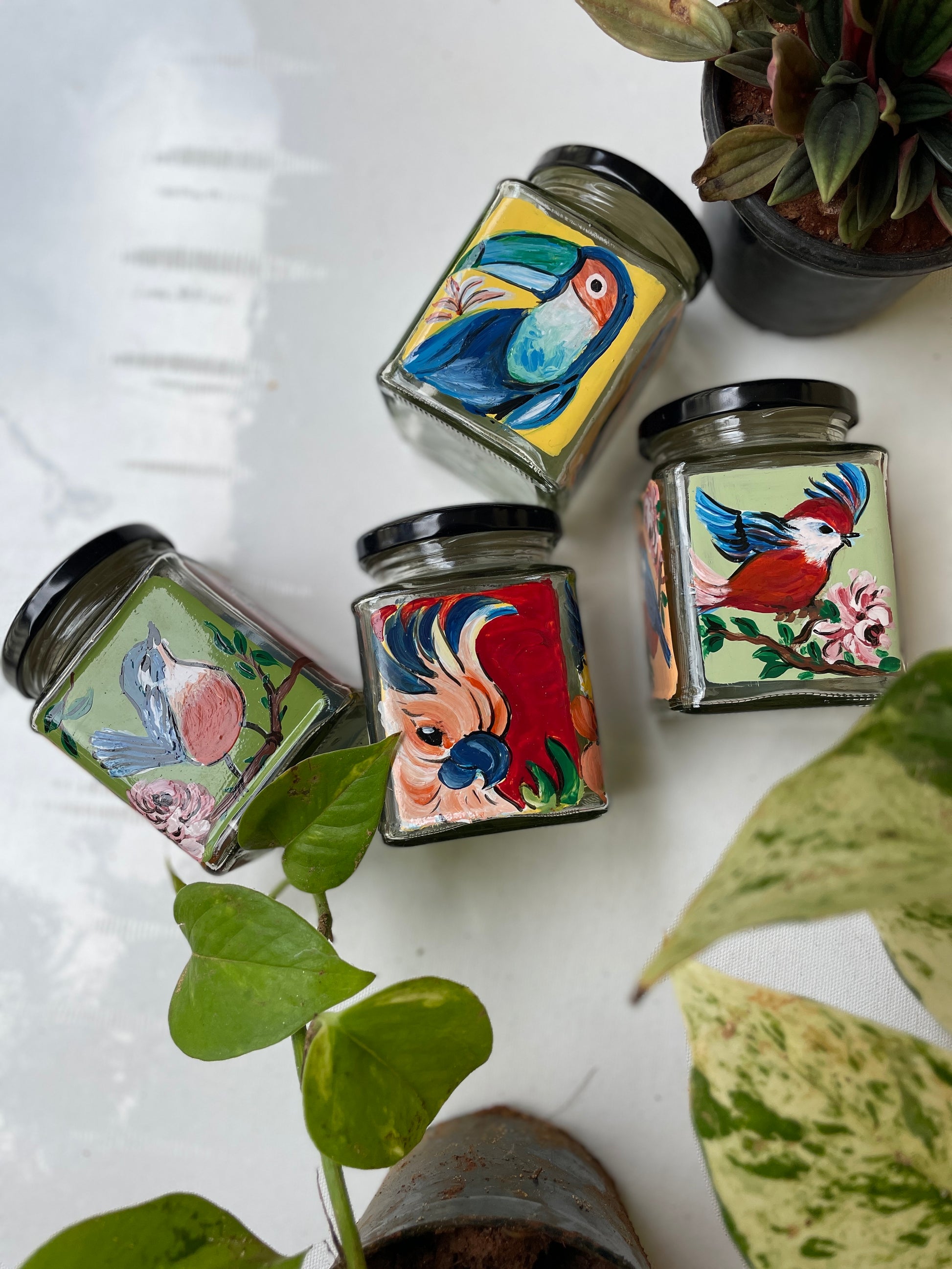 All 4 sides of the square jars are painted with different poses of the bird in different colours - so that if you get bored of one side, you can just switch to the other!
