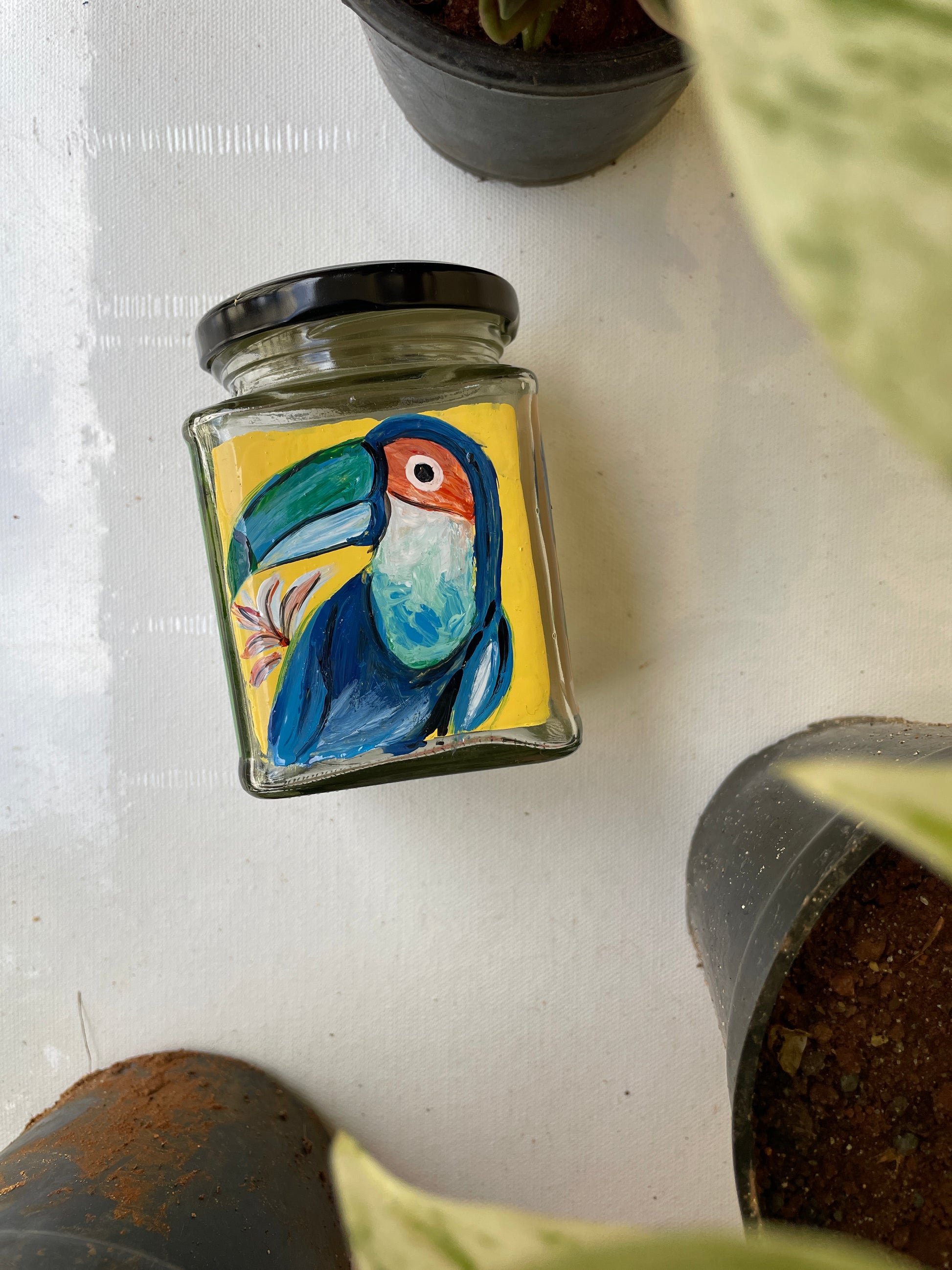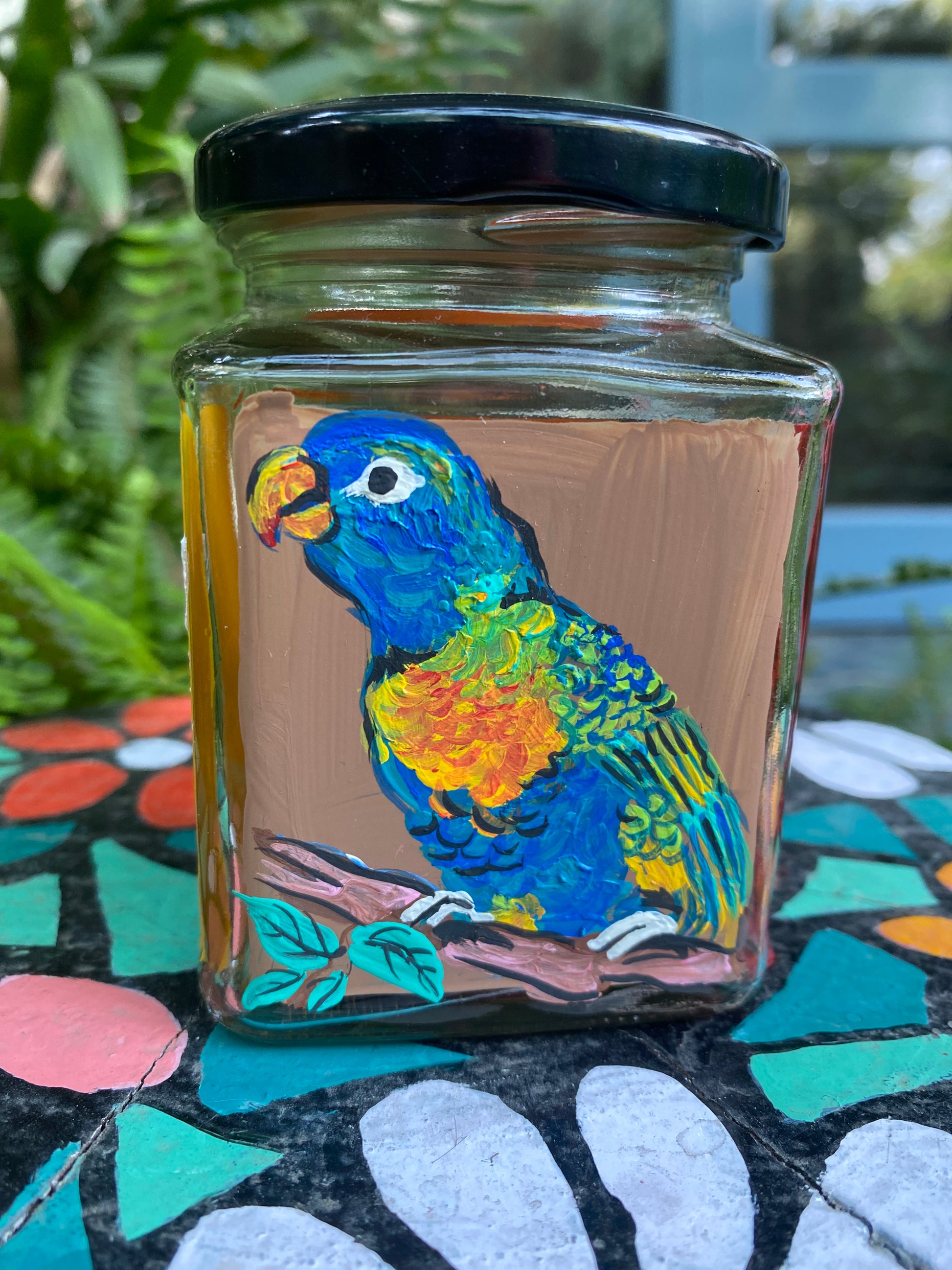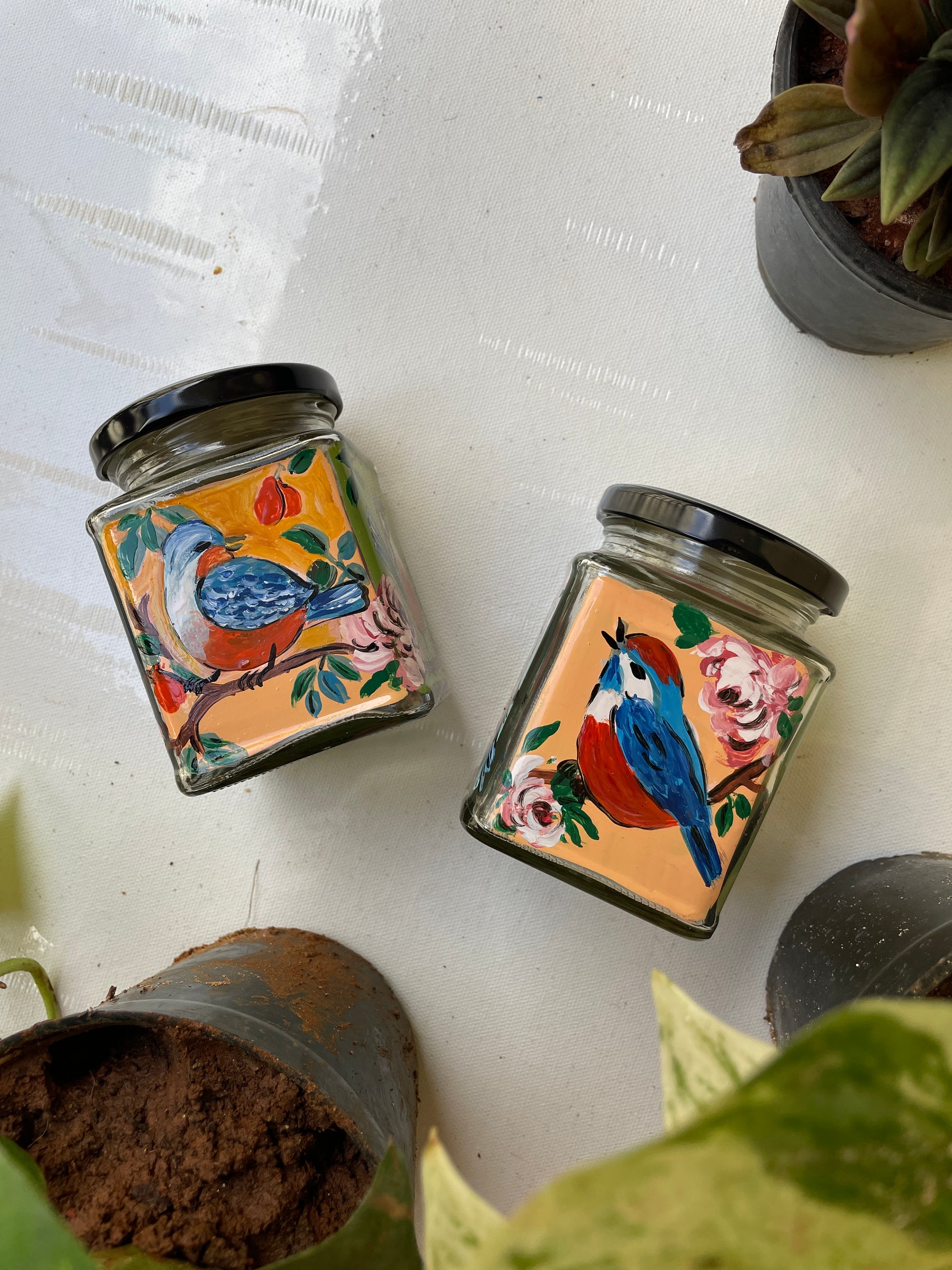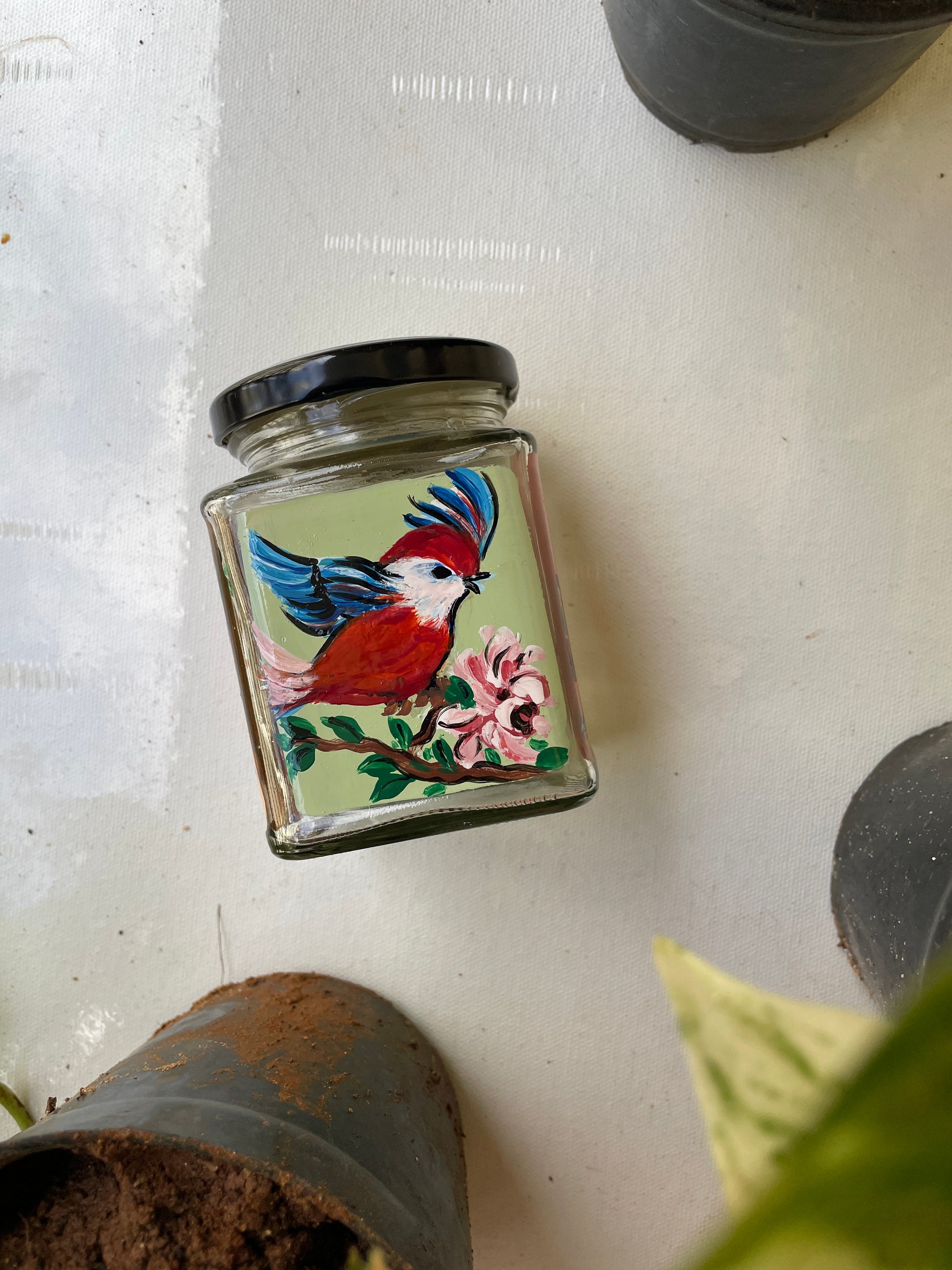 All 4 sides of the square jars are painted with different poses of the bird in different colours - so that if you get bored of one side, you can just switch to the other!