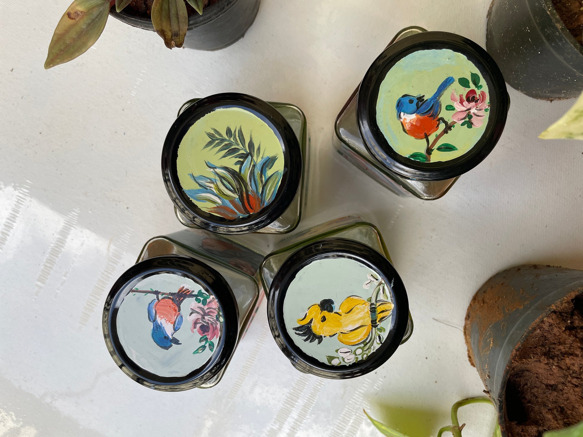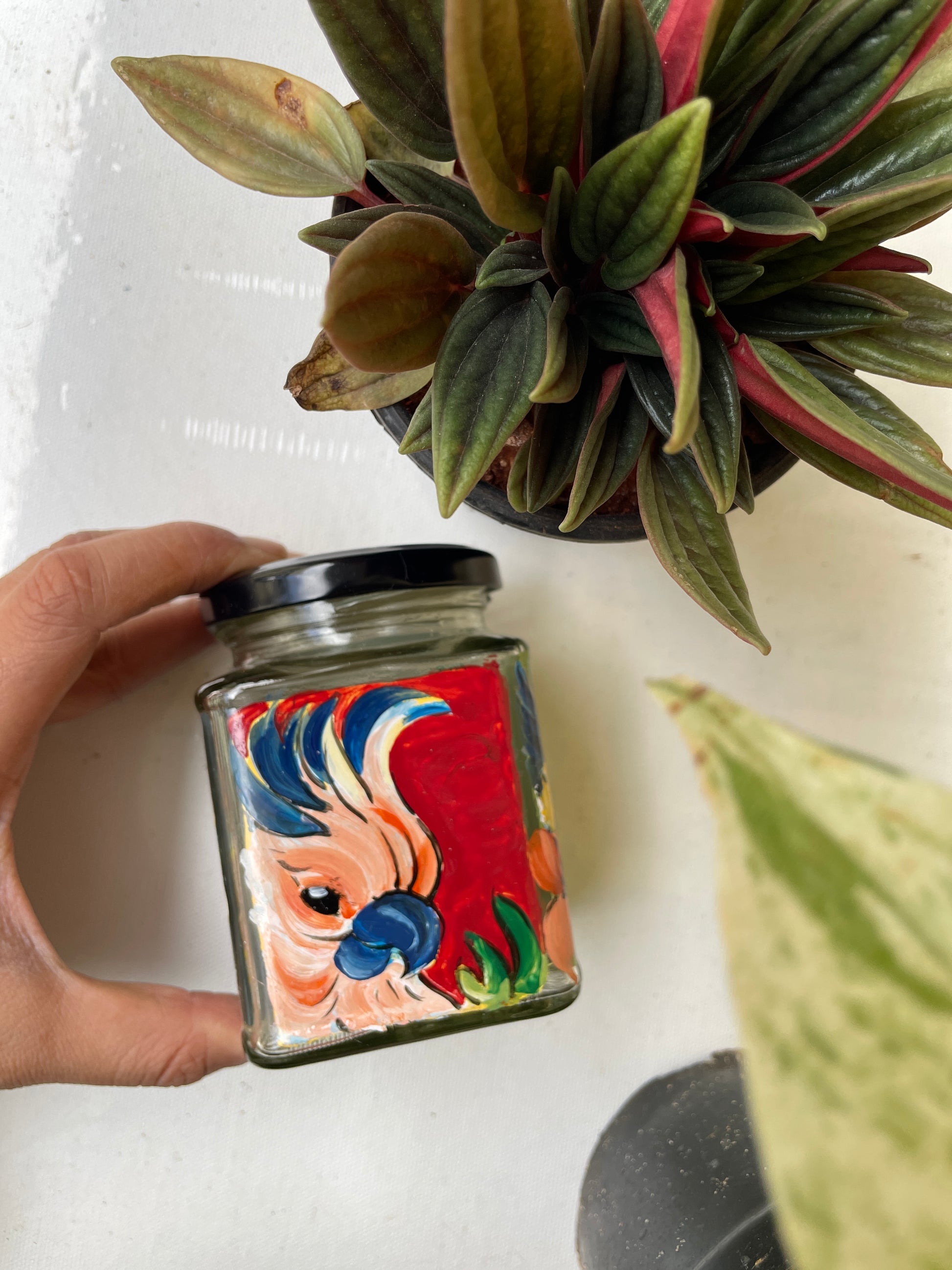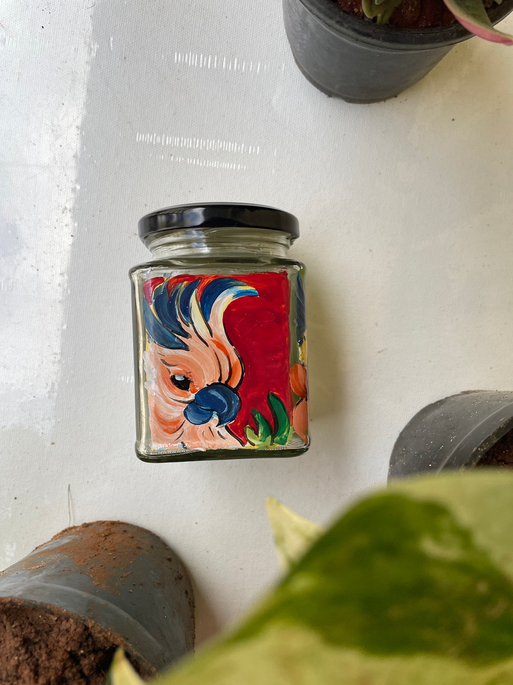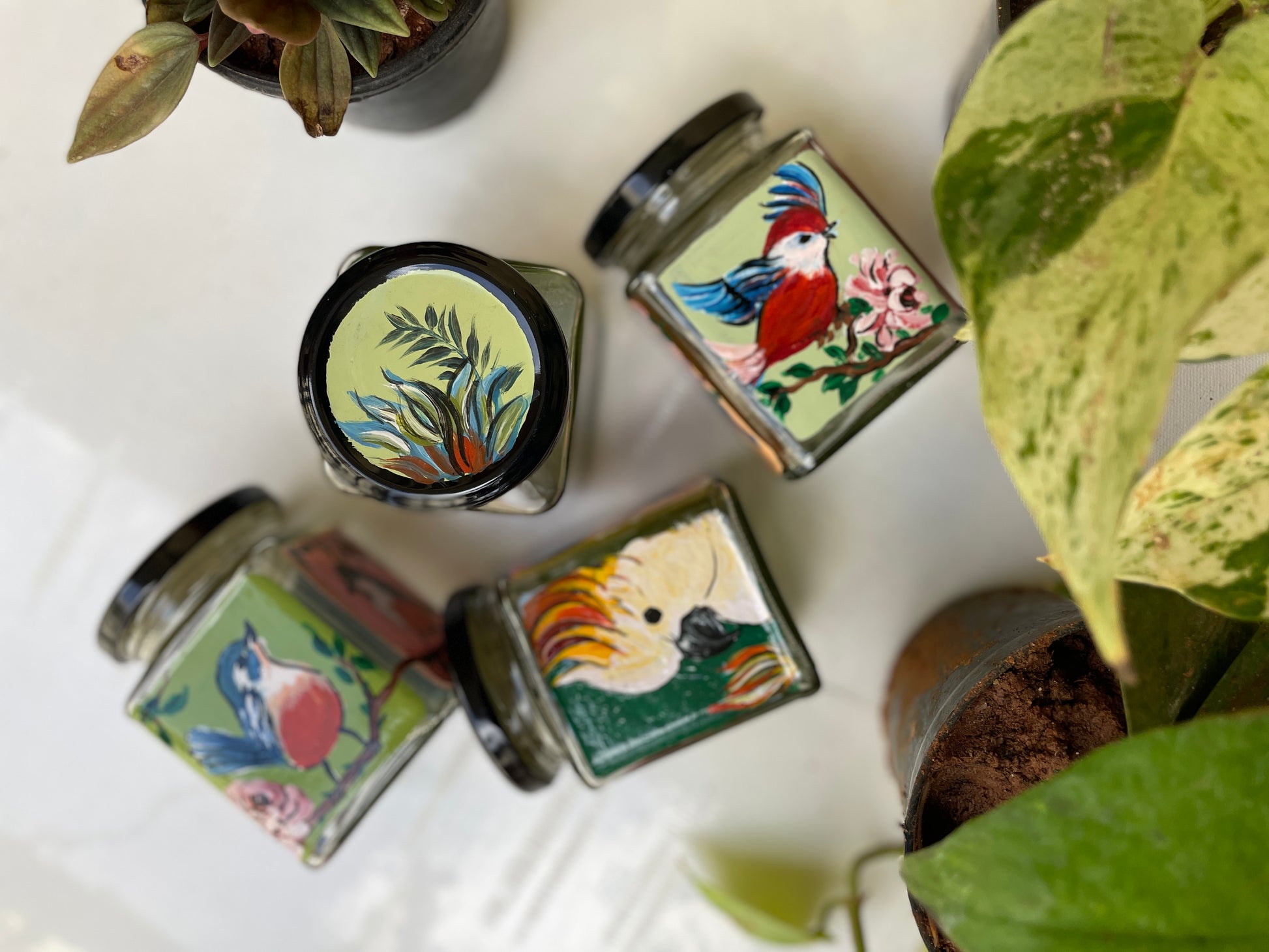 All 4 sides of the square jars are painted with different poses of the bird in different colours - so that if you get bored of one side, you can just switch to the other!